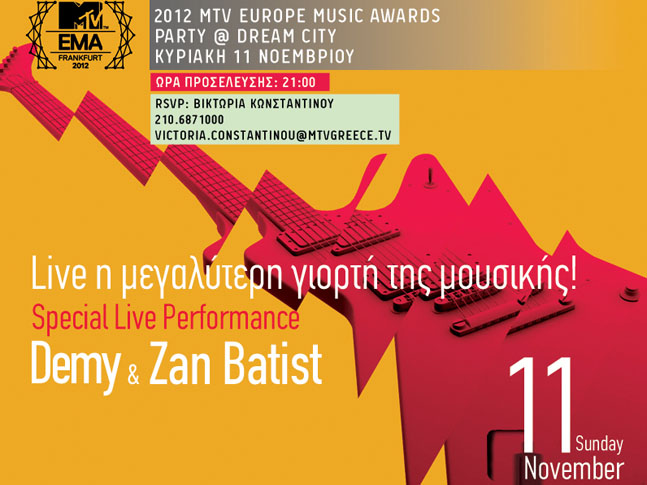 Tην Κυριακή 11 Νοεμβρίου ετοιμαστείτε για ένα μοναδικό MTV Europe Music Awards party με live προβολή των EMA, στην οθόνη του απόλυτου club Dream City (Ιερά Οδός 30-32, Γκάζι)! Μετά τα πετυχημένα ΜΤV Parties που έγιναν στο Dream City, έπεται συνέχεια πάντα powered by MTV. Δείτε live τη μεγαλύτερη γιορτή της μουσικής, τα 2012 MTV EMA. Και αμέσως μετά απολαύστε on stage την Demy και τον Zan Batist! Μπείτε τώρα εδώ πάρτε μέρος στο μεγάλο διαγωνισμό και κερδίστε διπλές προσκλήσεις. Το πιο hot EMA party ξεκινάει στις 00.00!